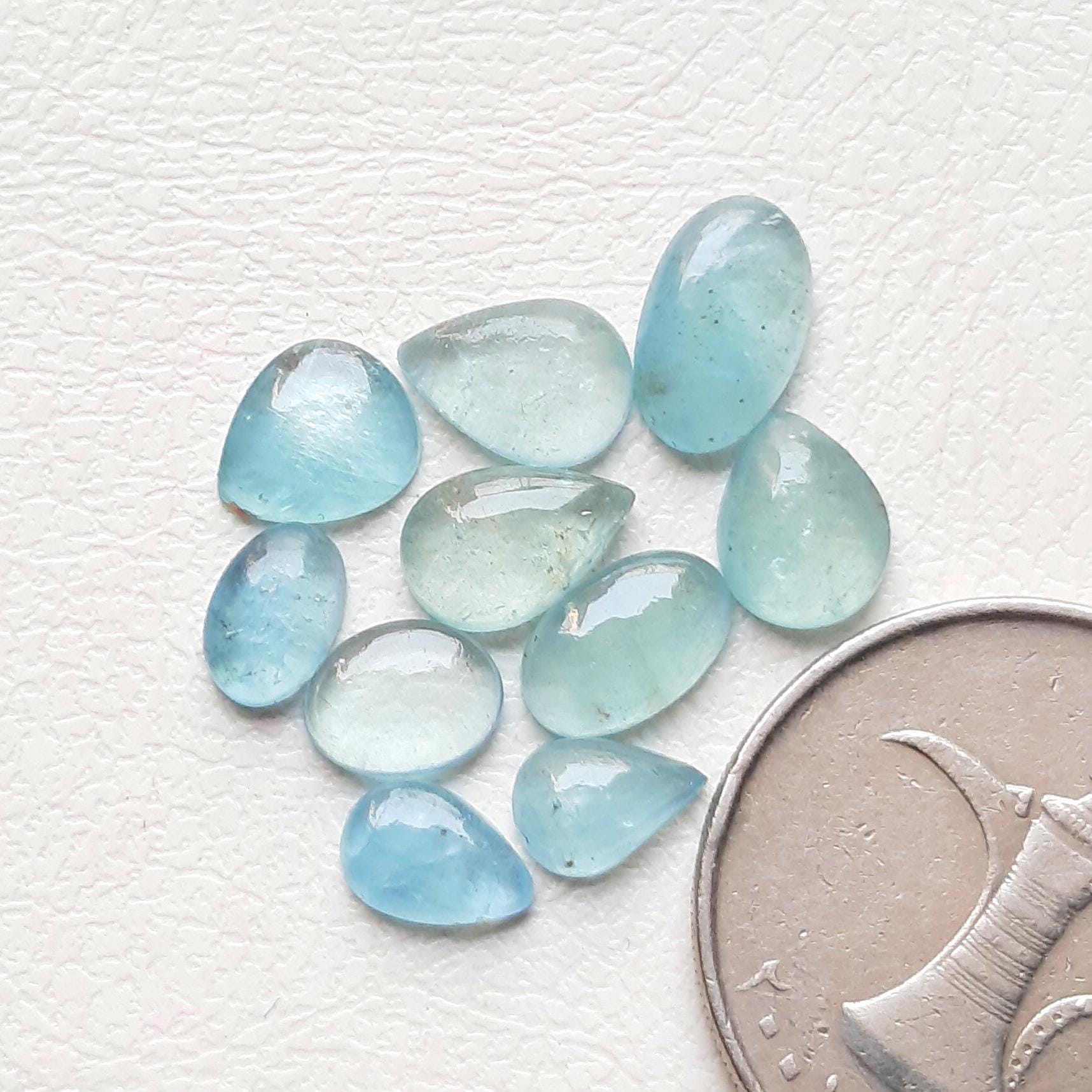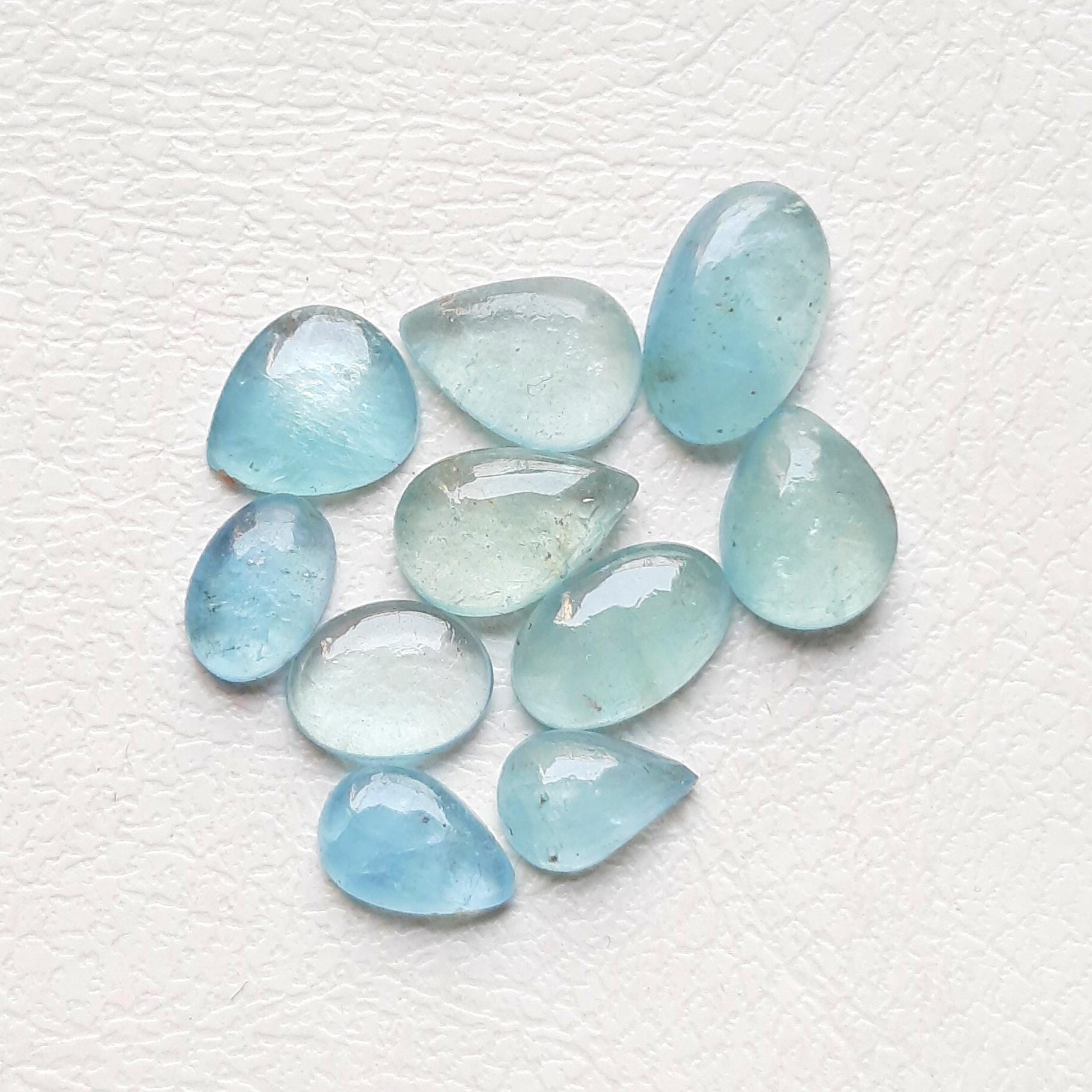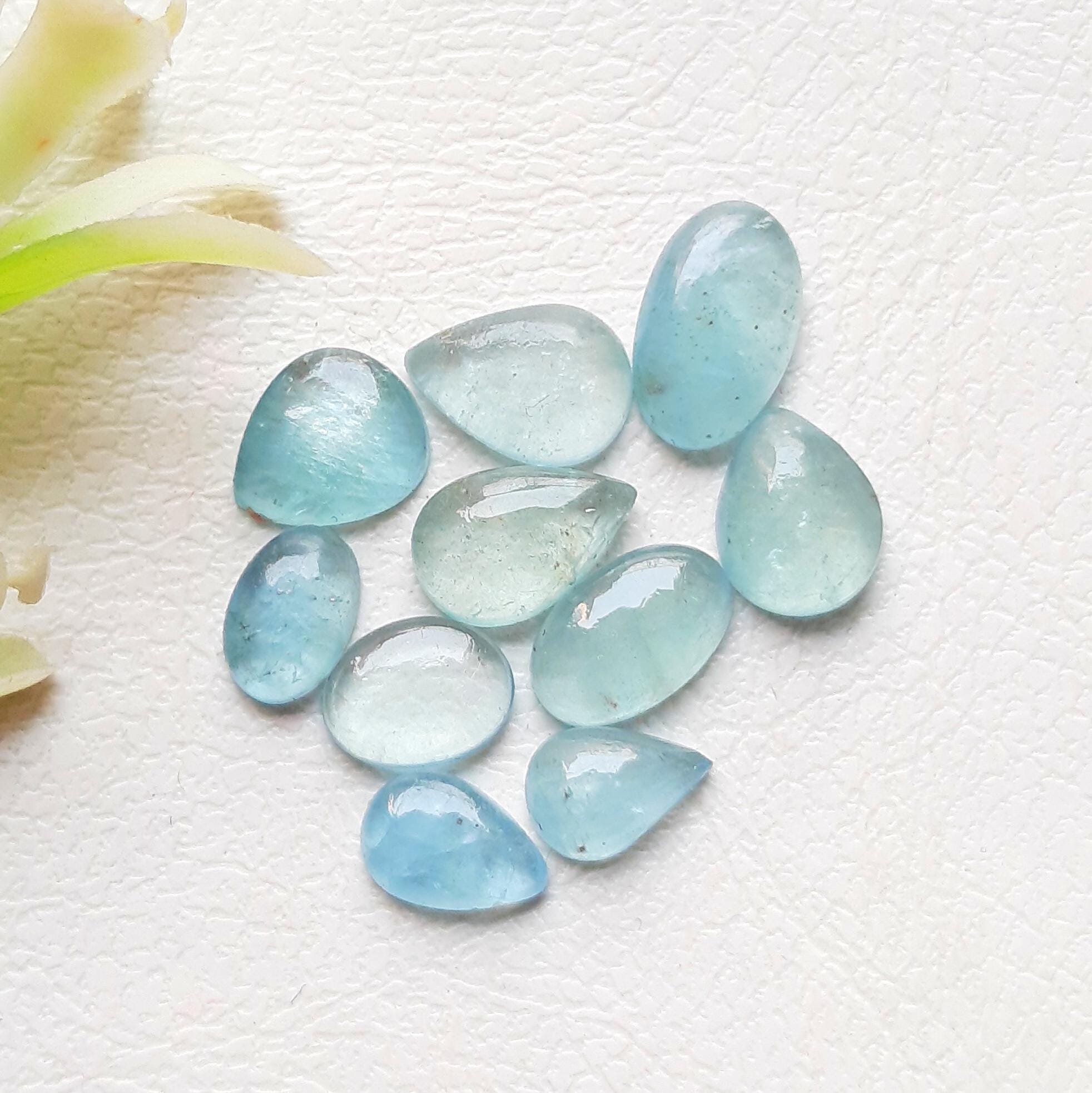 Natural Aquamarine Cabochon Loose Gemstone 10 Pieces Lot For Jewelry Making, Natural Aquamarine With Flat Back For Handmade Jewelry