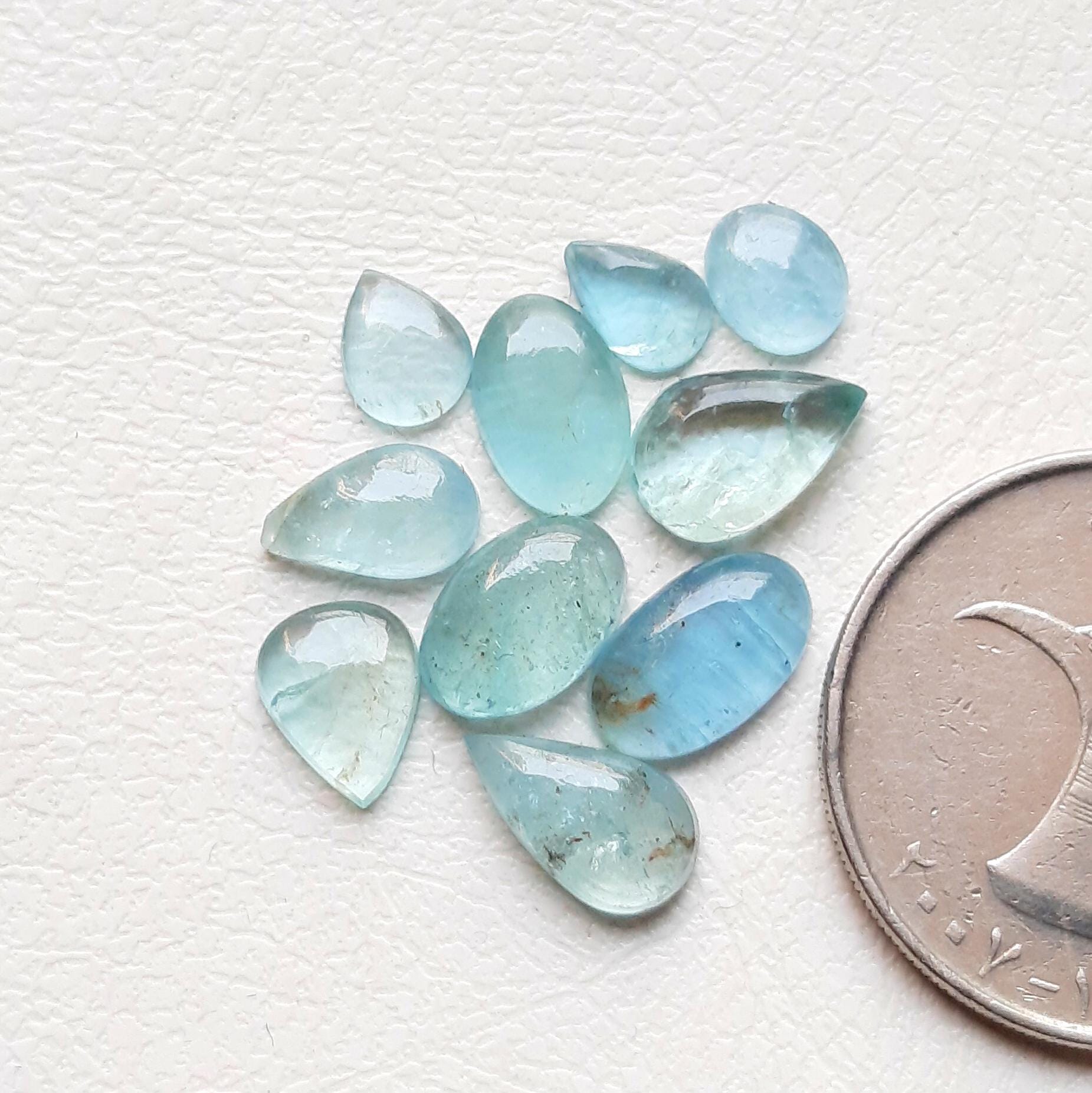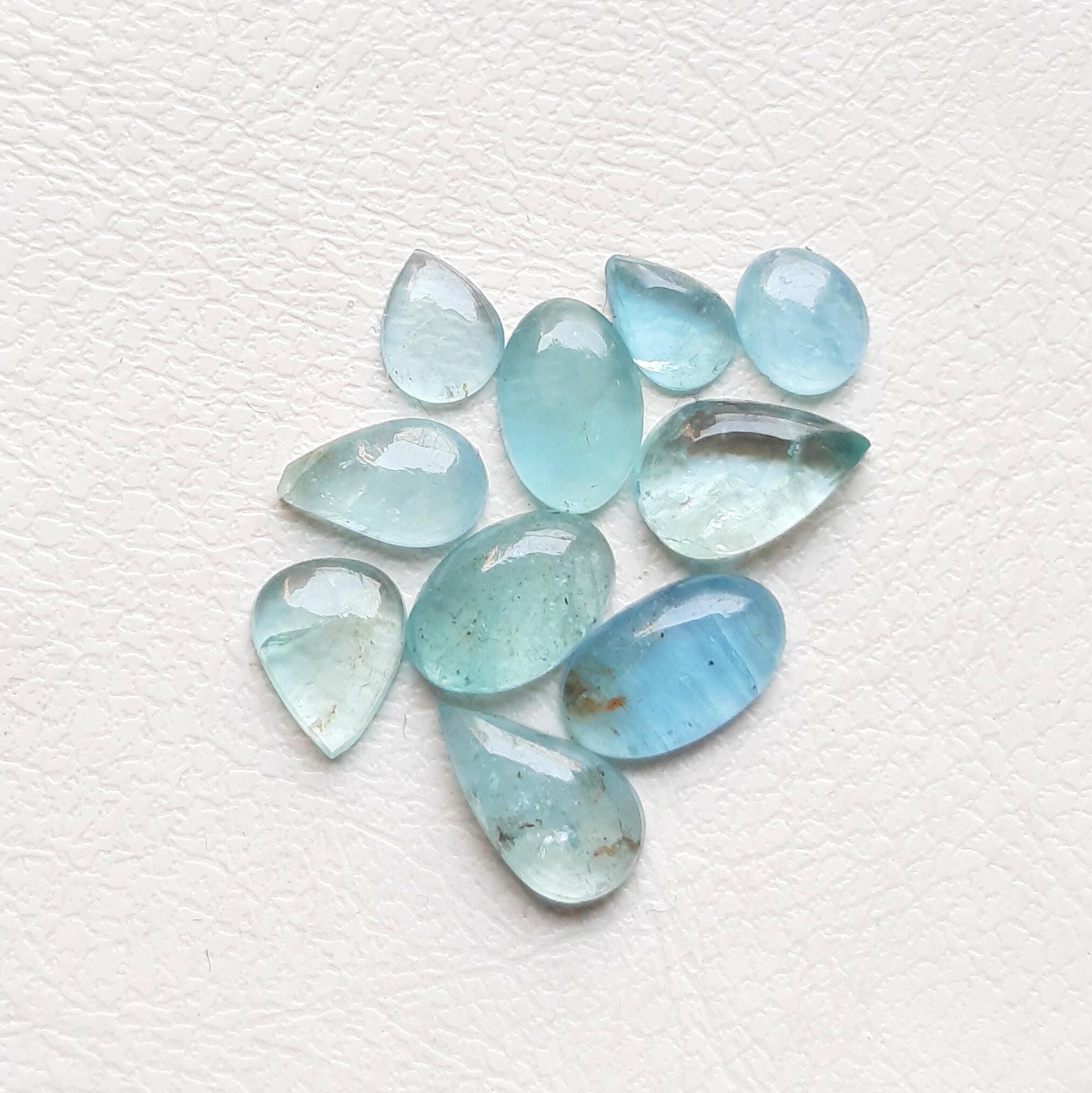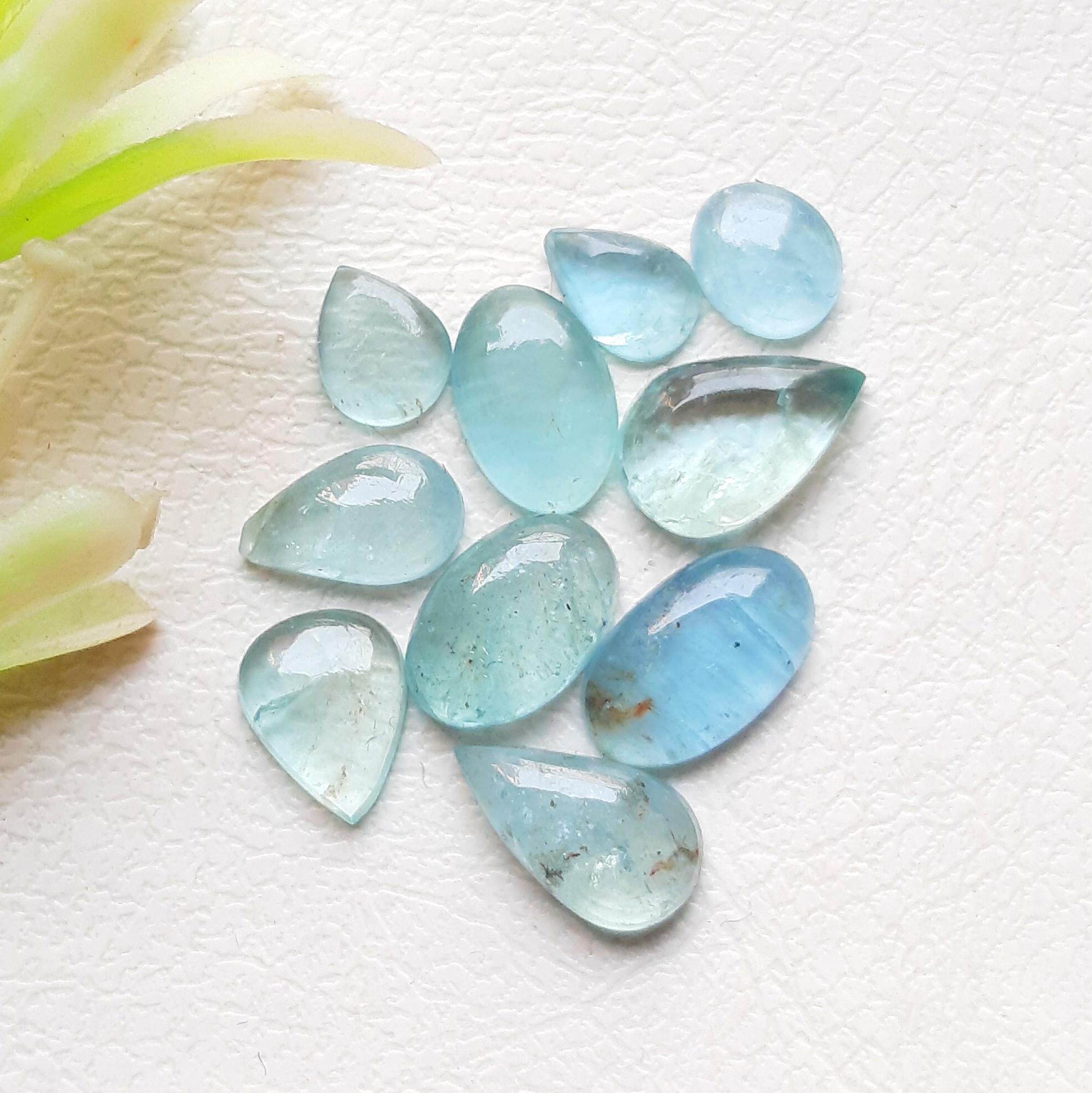 Natural Aquamarine Cabochon Loose Gemstone 10 Pieces Lot For Jewelry Making, Natural Aquamarine With Flat Back For Handmade Jewelry