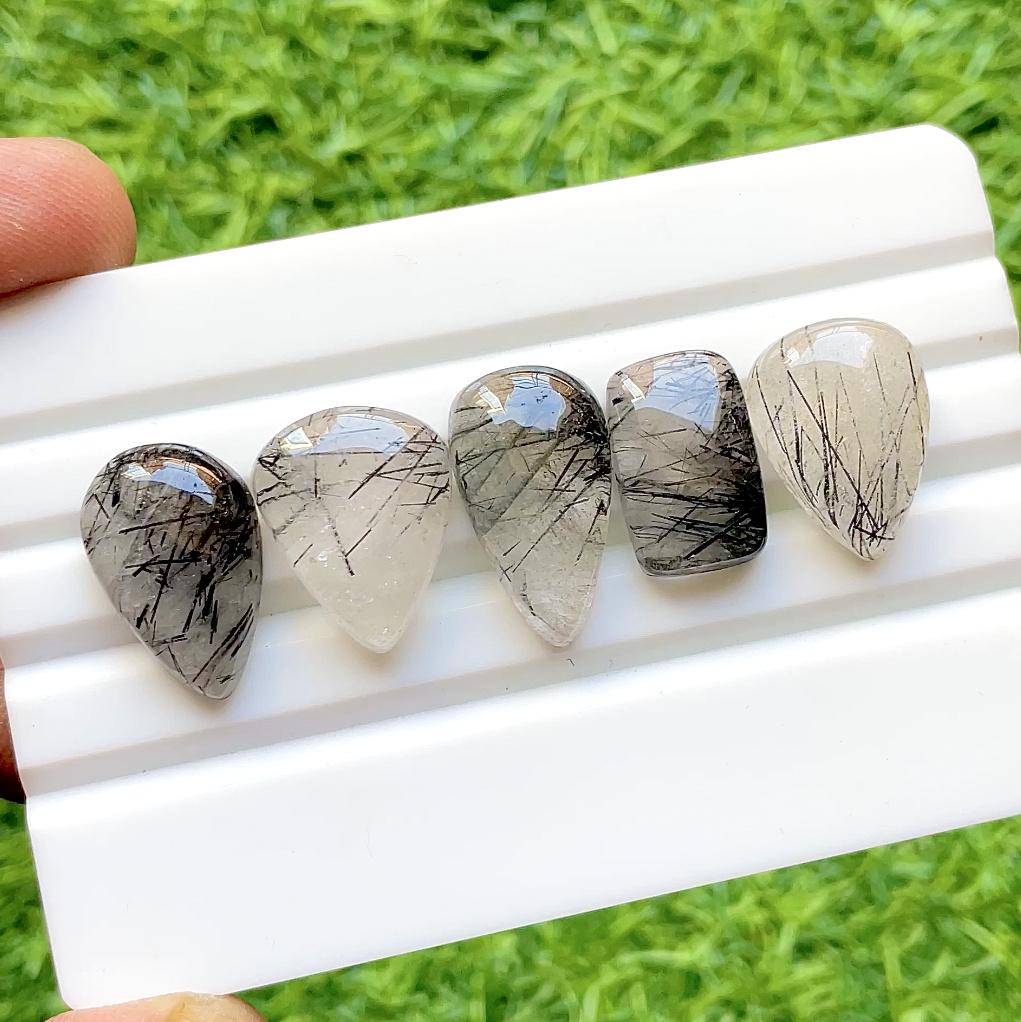 Natural Black Rutile Quartz Cabochon Loose Gemstone 5 Pieces Lot For Jewelry Making, AAA+ Natural Black Rutile Quartz For Handmade Jewelry