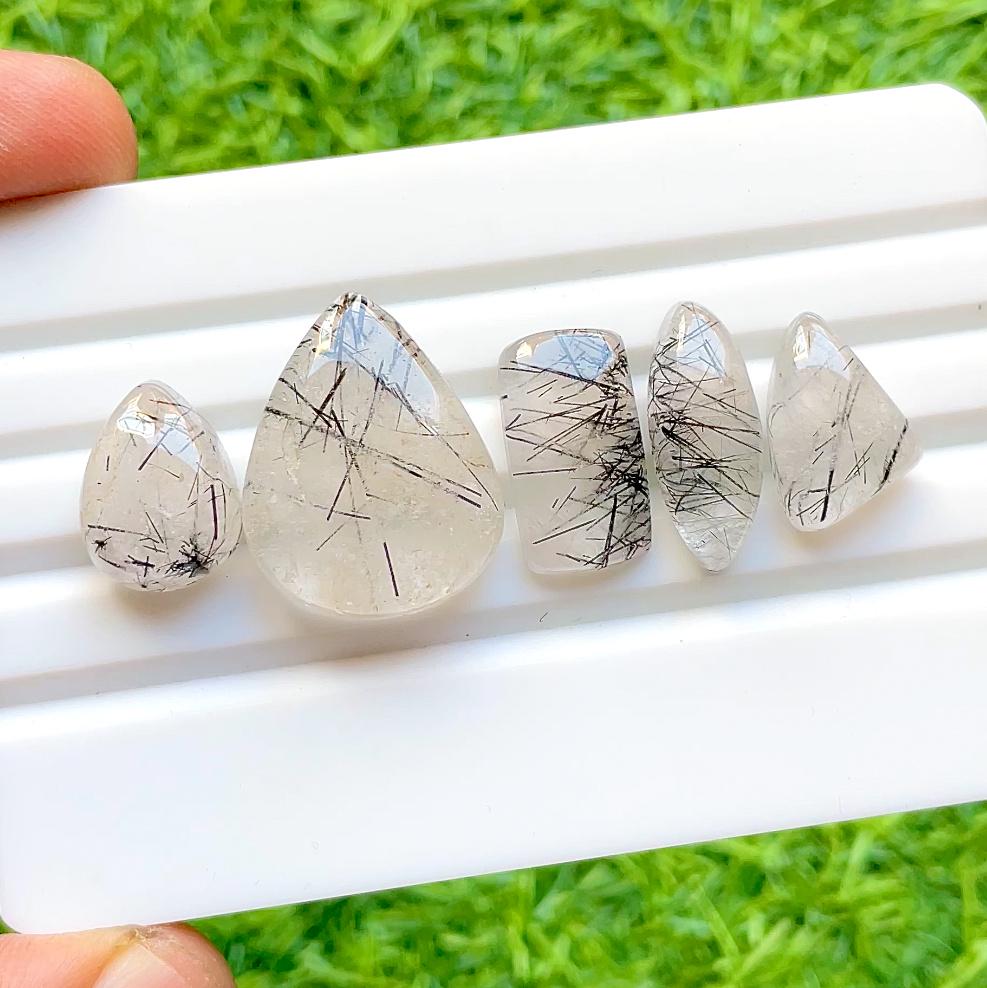Natural Black Rutile Quartz Cabochon Loose Gemstone 5 Pieces Lot For Jewelry Making, AAA+ Natural Black Rutile Quartz For Handmade Jewelry
