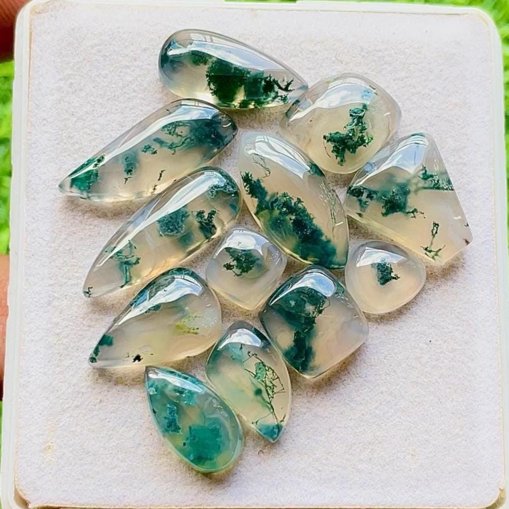 Moss Agate Gemstone Cabochon With Flat Back 12 Pieces Gemstone Lot For Jewelry Making, AAA+ Natural Moss Agate For Handmade Jewelry