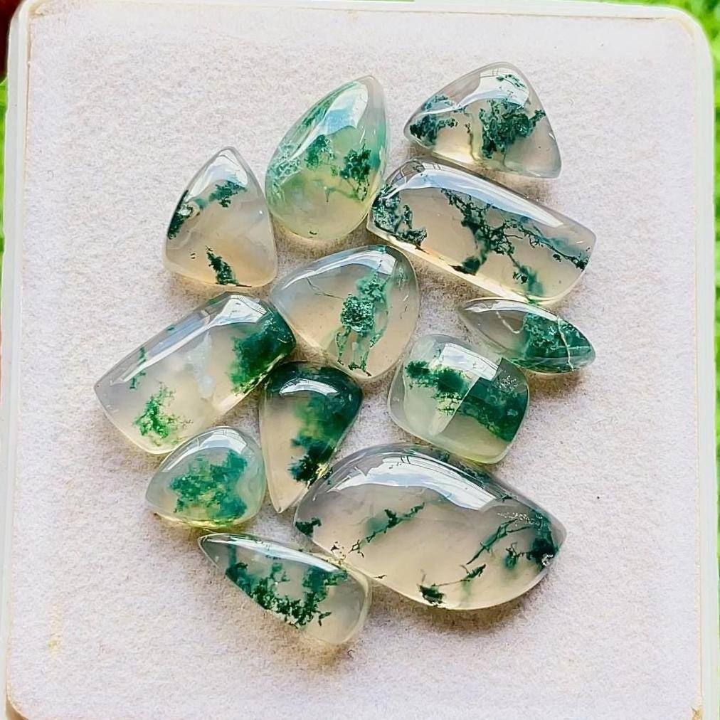 Moss Agate Gemstone Cabochon With Flat Back 12 Pieces Gemstone Lot For Jewelry Making, AAA+ Natural Moss Agate For Handmade Jewelry