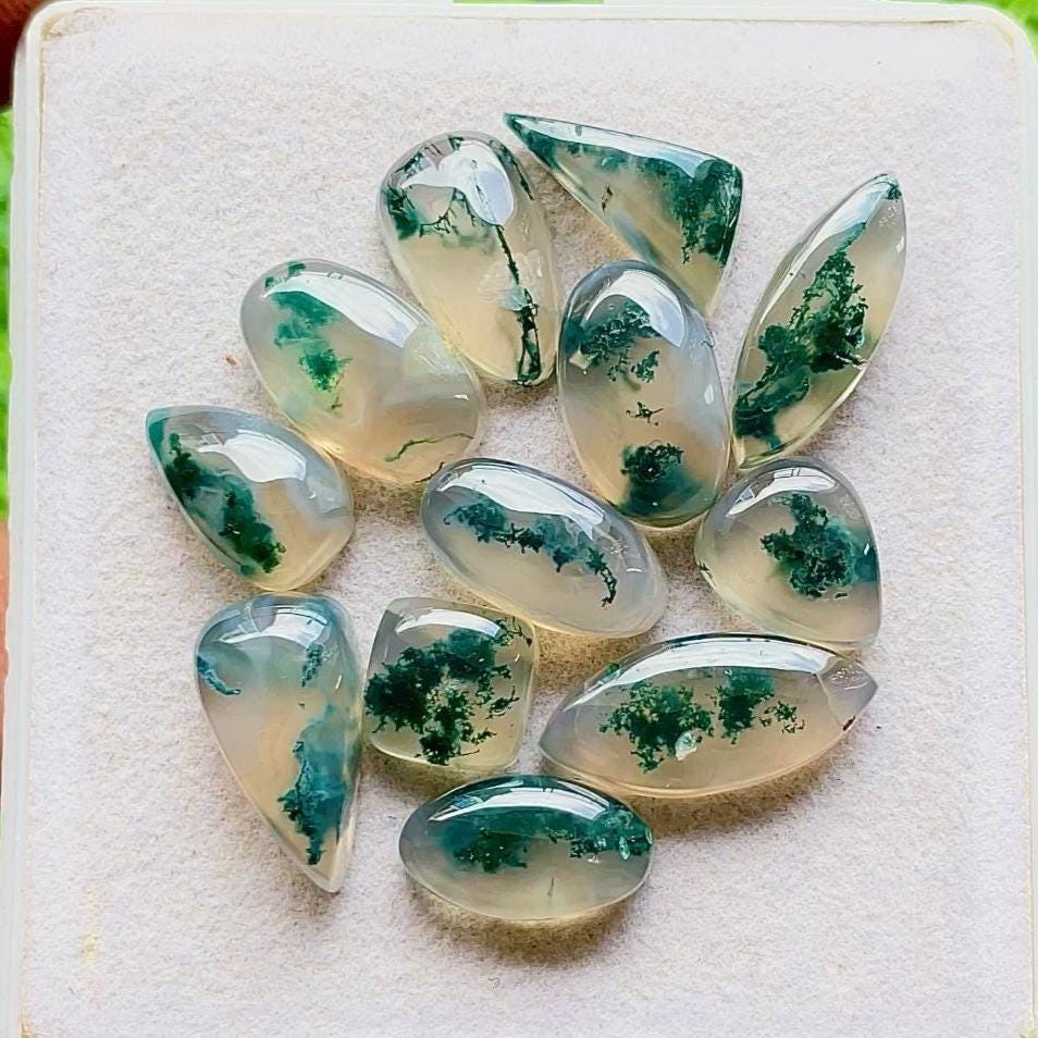 Moss Agate Gemstone Cabochon With Flat Back 12 Pieces Gemstone Lot For Jewelry Making, AAA+ Natural Moss Agate For Handmade Jewelry