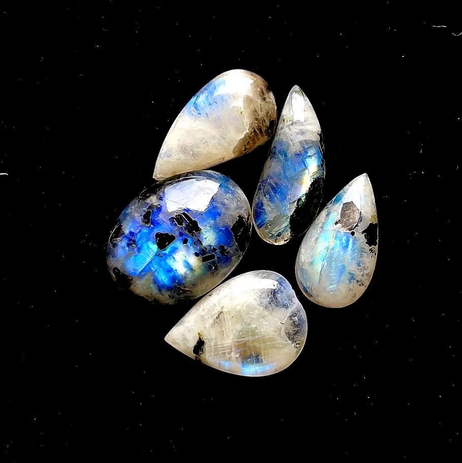 AAA+ Rainbow Moonstone Cabochon With Black Tourmaline Dot 5 Pieces Lot, AAA+ Natural Rainbow Moonstone For Handmade Jewelry