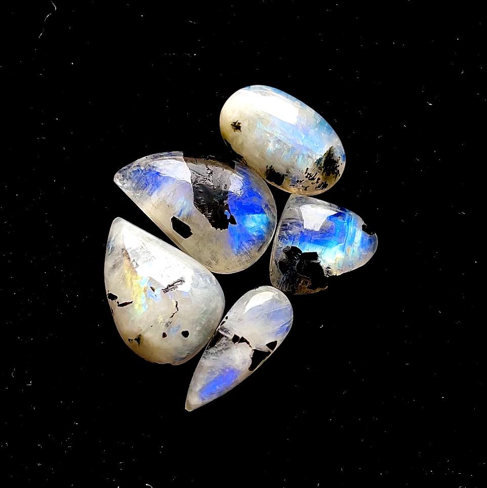 AAA+ Rainbow Moonstone Cabochon With Black Tourmaline Dot 5 Pieces Lot, AAA+ Natural Rainbow Moonstone For Handmade Jewelry