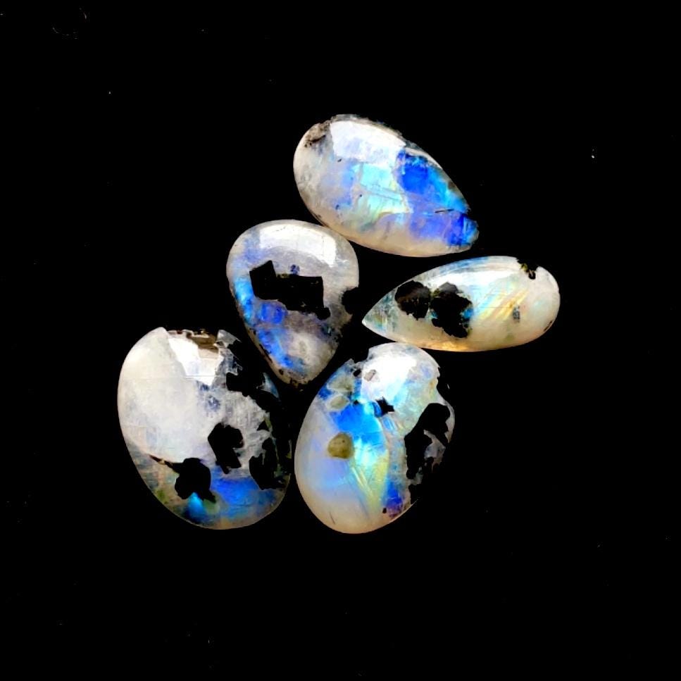 AAA+ Rainbow Moonstone Cabochon With Black Tourmaline Dot 5 Pieces Lot, AAA+ Natural Rainbow Moonstone For Handmade Jewelry