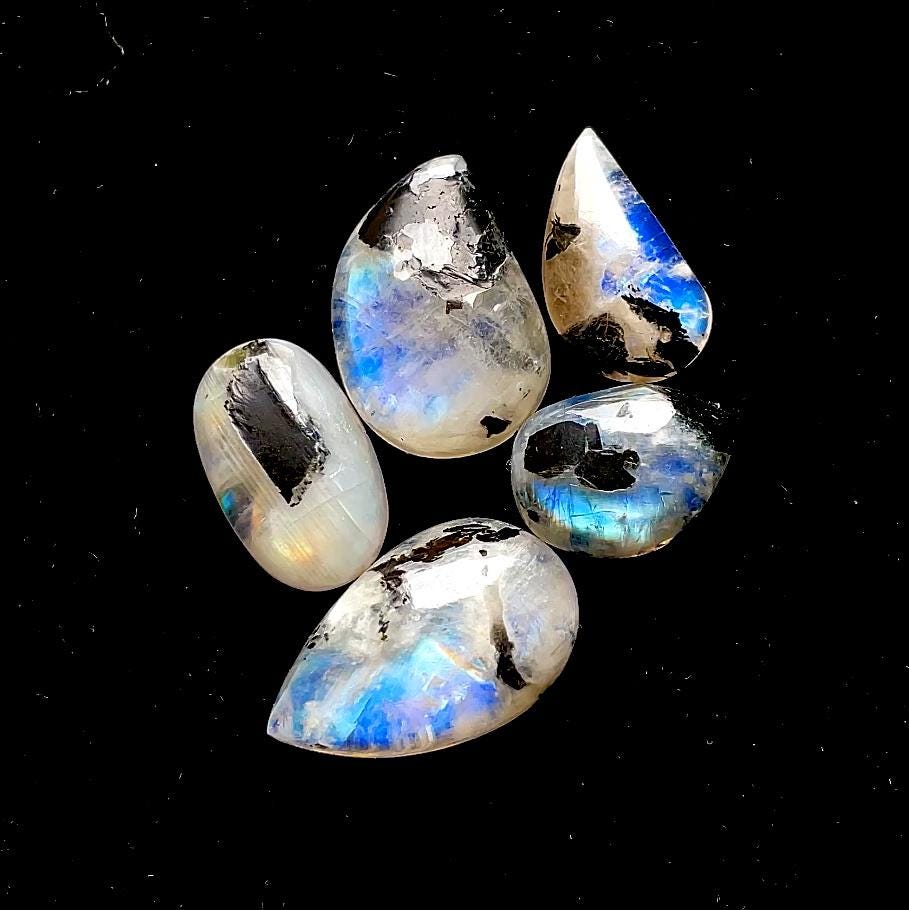 AAA+ Rainbow Moonstone Cabochon With Black Tourmaline Dot 5 Pieces Lot, AAA+ Natural Rainbow Moonstone For Handmade Jewelry