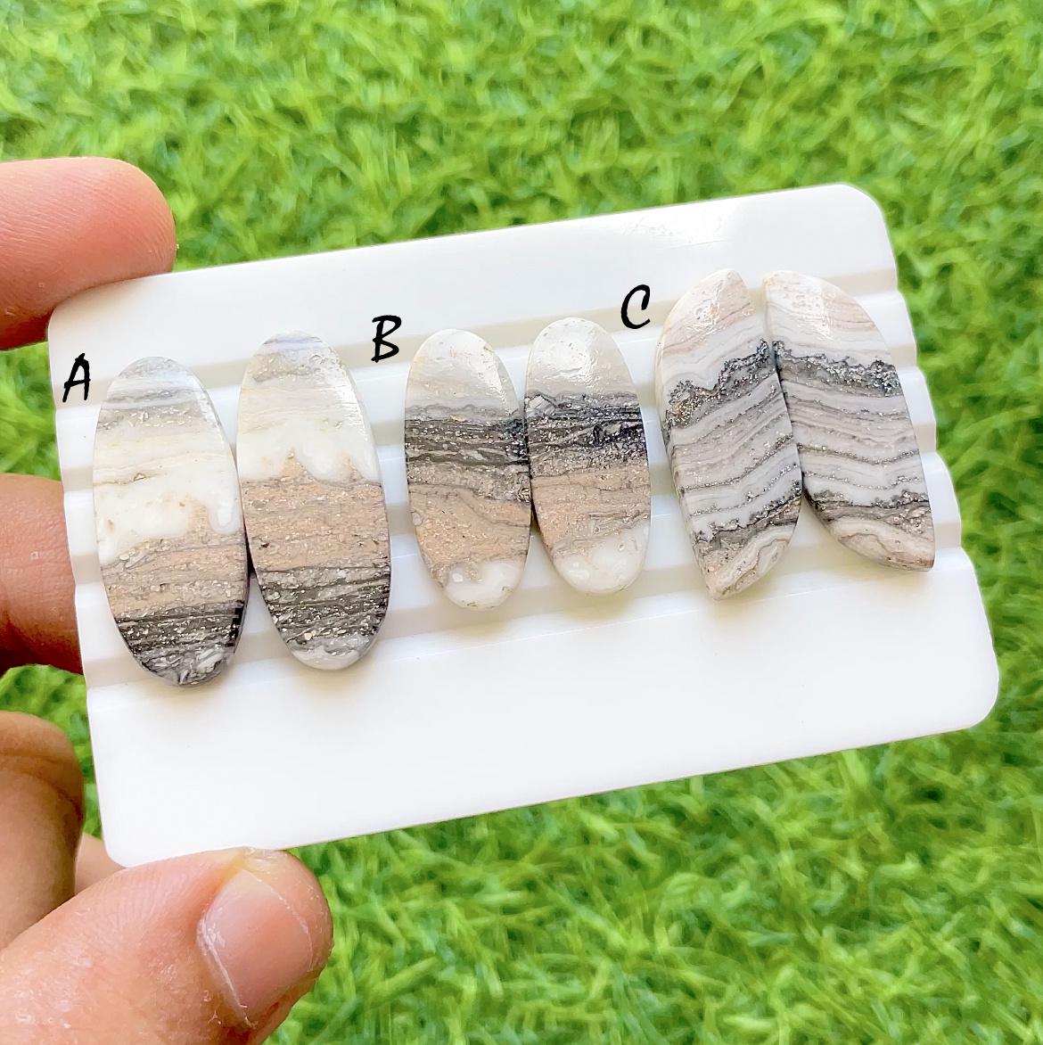 Monochrome Muse Picasso Jasper Cabochon Pair, Natural Striped Earth Tone Gemstone, Designer Matching Stones For Earrings